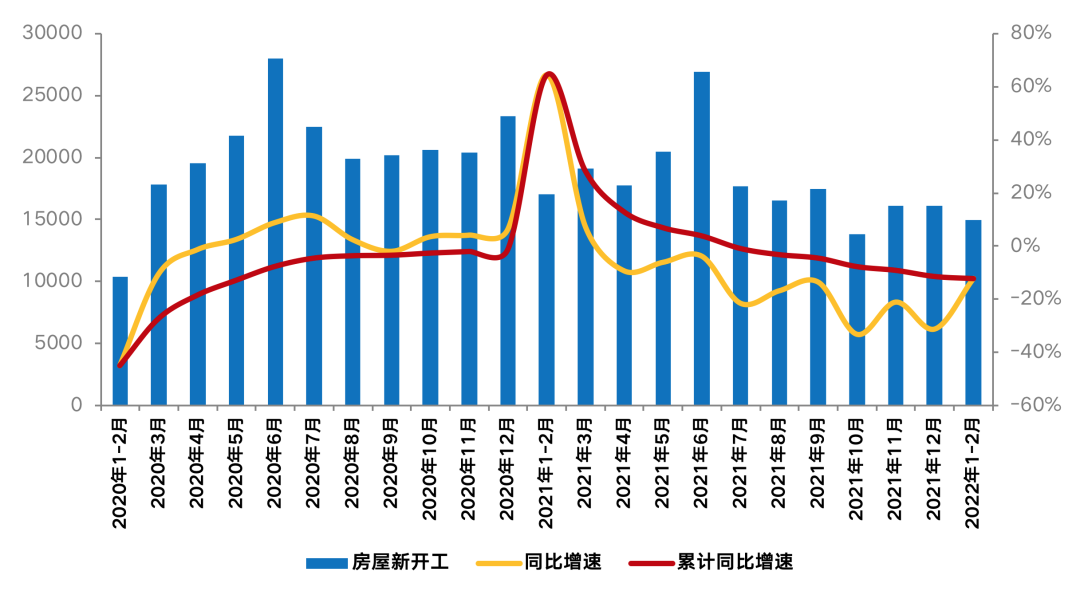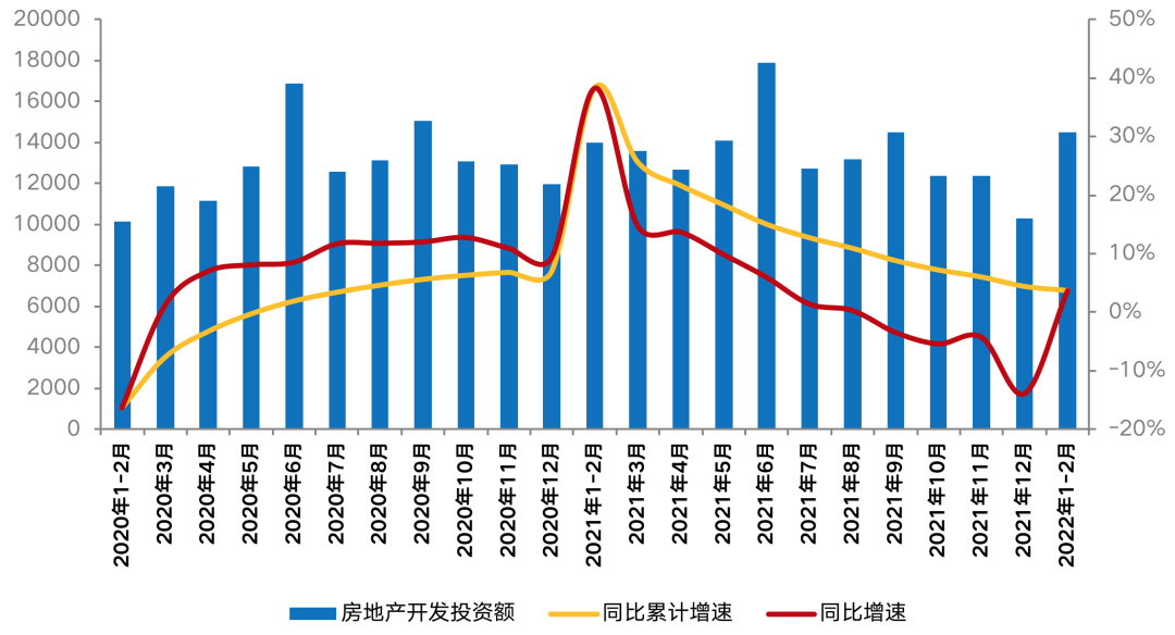 2022年1-2月開發投資額維持了正增長,成為前2月行業亮點數據。1—2月,全國房地產開發投資14499億元,同比增長3.7%。對比往年同期來看,為2016年起7年次低,僅高于2020年。