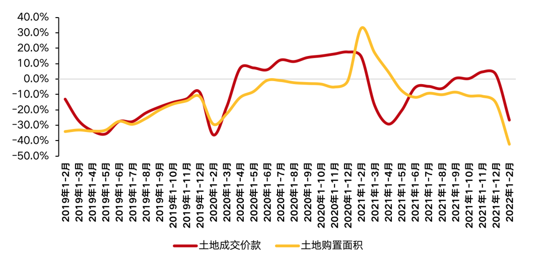 土地市場已經進入到了冰點。房地產資金面收到嚴控下,疊加1-2月并非22城集中供地節點,民營開發企業多已無力購置土地且購地動力不足。數據顯示,1-2月,房地產開發企業土地購置面積838萬平方米,同比下降42.3%;土地成交價款369億元,下降26.7%。