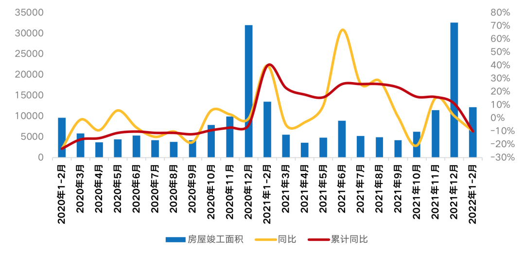 1-2月房屋施工、開工和竣工中僅施工仍保持同比正增長,其余兩項均同比下降。尤其是竣工面積累計同比增速由2021年末升11%變至降10%,告別“竣工牛”。