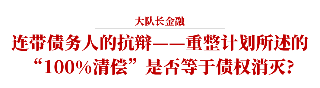 如前文所述,對于債權人而言, 重整計劃或是留債展期(可能一展就是十年)或是以明顯高于市價的價格“以物抵債”, 顯然債權人的損失并無法通過重整計劃得到填補, 債權也未得到實際清償。甚至該等債權人在破產程序中可能也未表決同意該等重整計劃, 而是因其他沒有第三方可追償的普通債權人均表決同意,因此, 重整計劃方才得以表決通過。