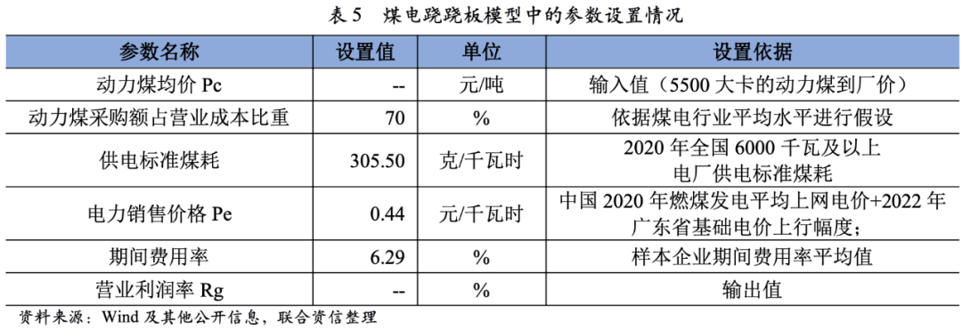 我們同時建立了模型對煤電企業的煤價盈虧平衡點進行測算得出,煤電企業營業利潤率為0%的動力煤(5500大卡)到廠均價為760元/噸左右,同時考慮到由于港口到電廠還有一定的運輸距離以及運輸費用,假設動力煤到廠價與港口價的價格差異為60元/噸左右,電廠的盈虧平衡點港口價為700元/噸左右。相關測算方法參見聯合資信研究報告——《煤電價格中樞與煤電行業“蹺蹺板”效應的研究》[4],此處我們不再贅述,相關測算假設如下。