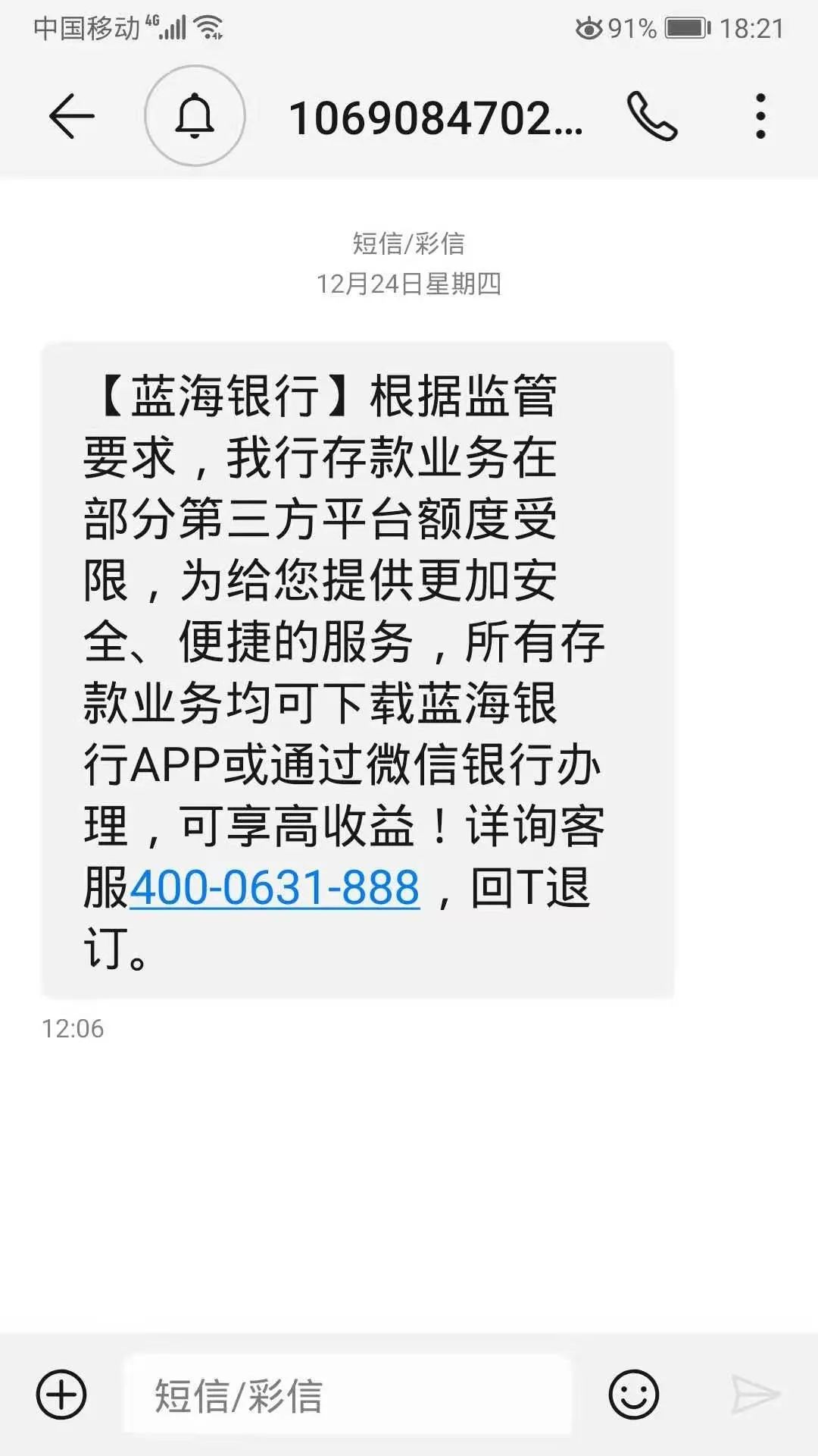 部分中小銀行已在開展自救。資深金融消費(fèi)者周敏向《財(cái)經(jīng)》記者提供了一張藍(lán)海銀行發(fā)送給她的短信截圖,內(nèi)容主要為邀請(qǐng)其通過藍(lán)海銀行app或微信銀行辦理相關(guān)業(yè)務(wù)。