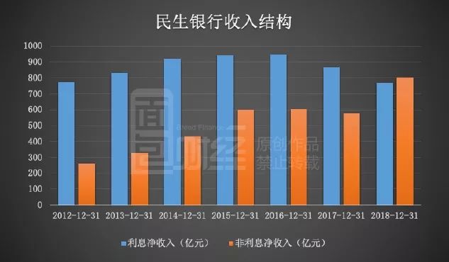 年報(bào)顯示,民生銀行的利息凈收入為766.8億元,較上年同期下滑了11.41%;非利息凈收入達(dá)800.89億元,較上年同期增長(zhǎng)了38.73%。