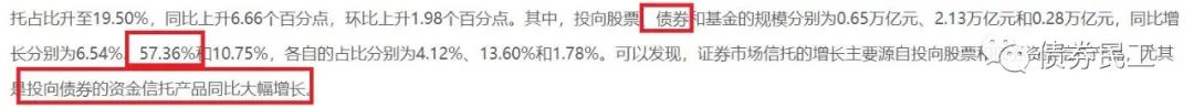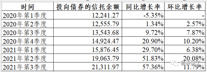 在此前中國信托業(yè)協(xié)會公布的2021年3季度末信托公司主要業(yè)務(wù)數(shù)據(jù)中,信托產(chǎn)品投向債券的規(guī)模為2.13萬億元,同比增長分別為57.36%!這個增長速率高的有點嚇人。