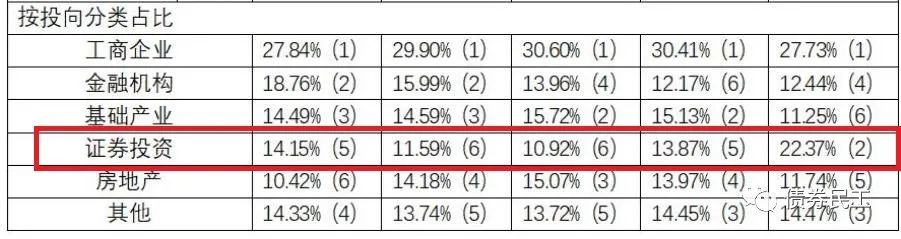 債券民工最關(guān)注的還是投向債券的信托規(guī)模。2021年度數(shù)據(jù)中,并未單獨披露投向債券的信托規(guī)模,只披露了投向證券投資的債券規(guī)數(shù)據(jù)。從這個數(shù)據(jù)也可以看出,2021年投向證券投資的占比大幅提升。