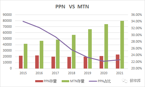 作為對比,交易商協(xié)會的私募品種定向工具PPN,在中長期限品種中的占比近年來一直處于下降的趨勢,規(guī)模穩(wěn)定在2萬億左右的水平。