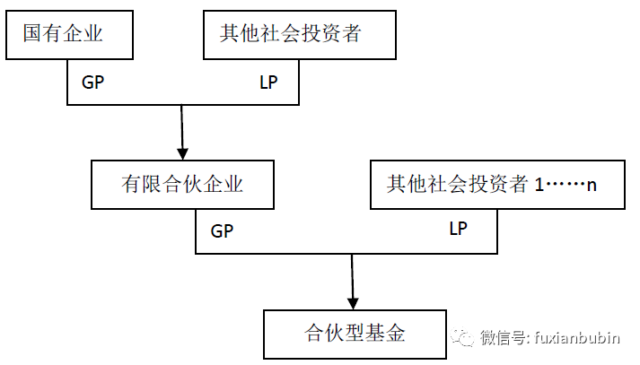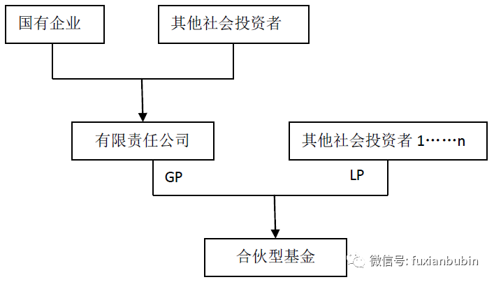 一是由國有企業與其他投資方共同出資設立有限責任公司,國有股權居多但不超過50%,再由該公司作為普通合伙人發起設立合伙型基金。具體股權結構如下圖所示: