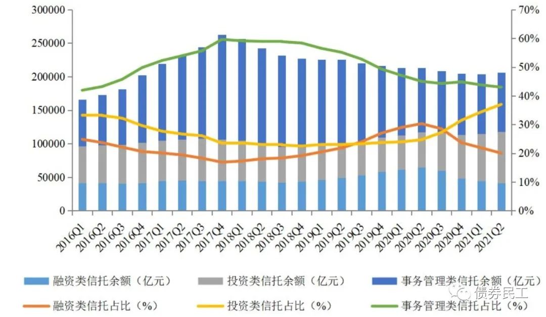 信托資產(chǎn)按照功能分類(lèi)來(lái)看,融資類(lèi)信托的余額和占比在2020年2季度末達(dá)到最高峰,此后持續(xù)呈現(xiàn)下降趨勢(shì)。2021年2季度末,融資類(lèi)信托余額為4.13萬(wàn)億元,相比2021年1季度末的4.45萬(wàn)億下降了0.32萬(wàn)億元,降幅為7.19%;相比2020年2季度末的6.45萬(wàn)億下降了2.32萬(wàn)億元,降幅高達(dá)35.97%!這個(gè)降幅不可謂不高,在實(shí)踐中大大降低了信托產(chǎn)品的融資功能。