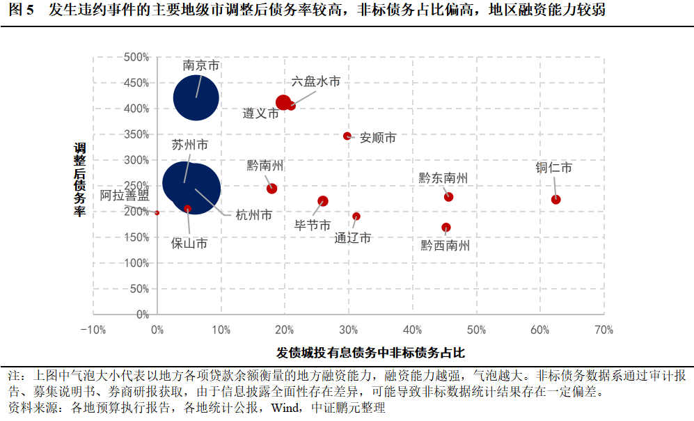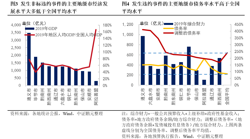 從地區經濟發展水平來看,發生非標違約事件的主要地級市經濟發展水平低于全國平均,其中阿拉善盟人均GDP水平較高,主要系該地常住人口規模較小,僅25.1萬人,實際經濟實力仍較弱。從地區債務率來看,發生非標違約事件的主要地級市債務率高于全國平均債務率,遵義市、六盤水市、安順市以及黔南州調整后債務率高于全國平均數。