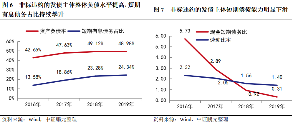 (2)從區域特征來看,非標違約地區經濟實力較弱,債務率較高,非標占比偏高,且地區融資能力較弱;從主體財務特征來看,非標違約的發債城投主體短期償債能力快速下滑,短期償債壓力明顯增加。需特別關注具有上述風險特征的城投主體。