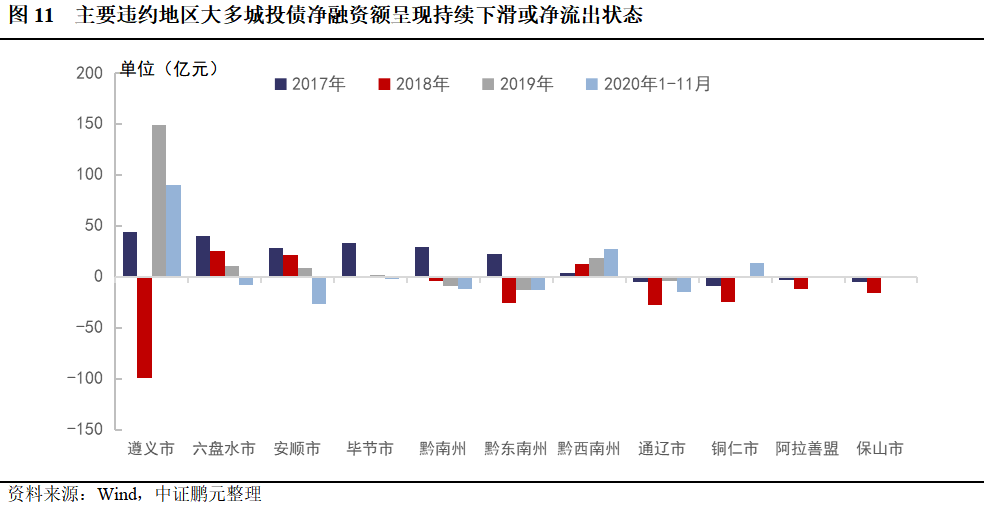 從違約平臺所處地級市城投債發行情況來看,除遵義市、黔西南州外,其余地區城投債凈融資額呈現持續下滑或凈流出狀態,非標違約對區域城投發行影響較大。2019年遵義市凈融資額有所回升,可能源于以下因素:首先,2019年初遵義市長拜會國開行貴州省分行,雙方達成一致意見:遵義作為革命老區,是黨中央、國務院重點關心關注區域,國開行貴州省分行將按照總行要求,不斷創新融資模式,圍繞既有利于發展,又有利于化債目標,在推動遵義經濟社會發展中實現多贏,該舉措一定程度上提升了市場投資者信心;其次,近年遵義市GDP、財政收入在貴州省內均排名第二位,地區經濟實力相對較強,相較其他違約區域,省政府及地方政府可能給予遵義市內城投平臺的支持力度更大。近年黔西南州凈融資額呈上升趨勢,可能源于在發生違約事件的主要地級市中,黔西南州債務率水平相對較低,且已知的該地城投非標違約事件最早發生于2020年3月,僅發生一起;但黔西南州整體凈融資規模仍較低。