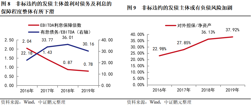 從償債指標來看,近年非標違約的發債主體資產負債率有所提升,2019年末平均值提升至48.98%,但較2016年末增幅不大。短期償債能力方面,非標違約的發債主體短期有息債務占比提升較快,自2016年末的13.58%增至2019年末的24.34%,同時現金短期債務比自2016年的5.73下降至2019年的0.31,短期償債壓力明顯加大。2016年以來,非標違約的發債主體有息債務與EBITDA之比總體有所上升,EBITDA利息保障倍數持續下滑,盈利對債務及利息的保障程度整體有所下降。此外,近年非標違約的發債主體對外擔保占凈資產的比例持續增加,考慮到城投平臺對外擔保實際多為對區域內平臺擔保,地區互保風險有所加大,這也導致一家城投平臺非標違約后,債務風險極有可能向區域內其他平臺蔓延。