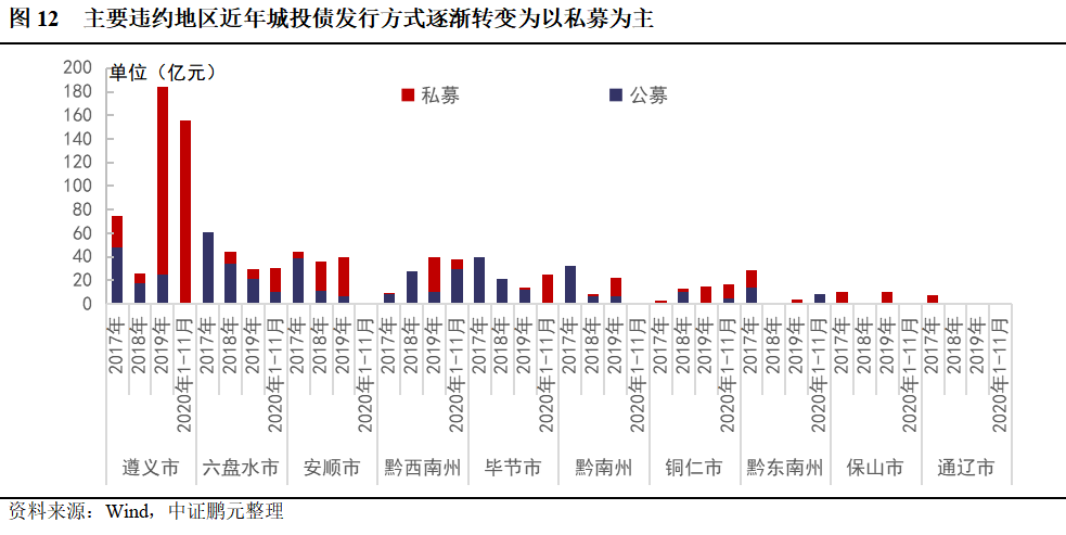 (3)發債城投平臺非標違約對自身及所處地區城投債發行影響較大,對上級區域城投債發行影響較??;違約后所處地區城投債發行轉為以私募發行為主,債券發行期限有所縮短,發行利率抬升。若無強有力措施提振市場信心,非標違約地區城投債發行將極大程度壓縮。