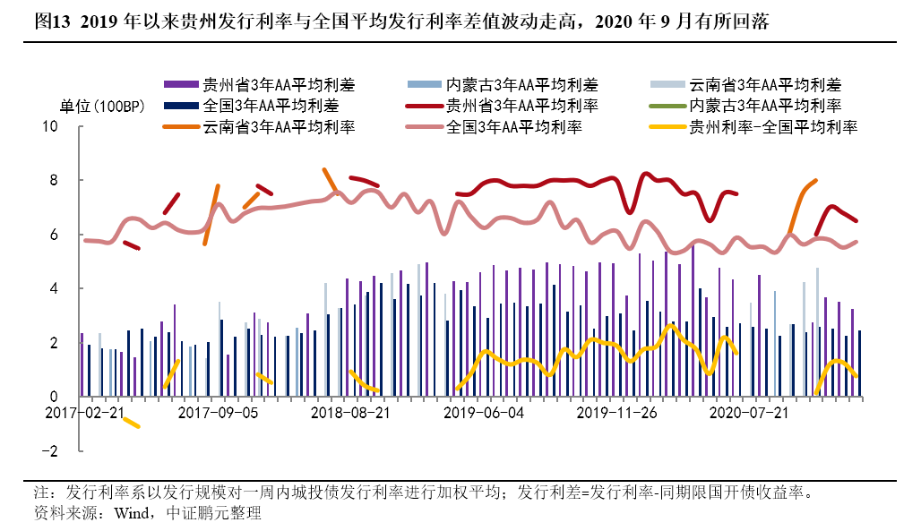 從主要違約地區城投債發行利率來看,2019年起貴州省城投債發行利率與全國平均發行利率之差波動走高,2020年初最高達到262BP,2020年9月以來,隨著貴州省利用茅臺化債的力度加大,市場對貴州城投認可度有所提升,債券發行利率有所回落;2018年以來云南地區城投債發行利率確有明顯抬升,2017-2019年及2020年1-11月,3年期AA級別城投債平均利差分別為2.53、3.96、4.36和3.79,整體有所增長;內蒙古地區城投債發行期限、發行主體級別較分散,發行利率未有明顯趨勢。