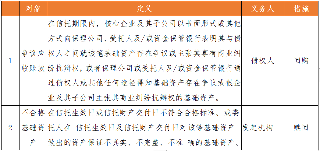 關(guān)于基礎(chǔ)資產(chǎn)的完整性,保理公司因提供保理服務(wù)而從債權(quán)人處受讓應(yīng)收賬款債權(quán),但是保理公司承擔(dān)債務(wù)人到期不履行付款義務(wù)風(fēng)險(xiǎn)的前提在于基礎(chǔ)交易不存在商業(yè)糾紛。為使信托計(jì)劃對(duì)基礎(chǔ)資產(chǎn)的權(quán)利更為完整和周延,信托計(jì)劃應(yīng)委托人對(duì)債權(quán)人享有的、要求債權(quán)人履行爭(zhēng)議應(yīng)收賬款債權(quán)回購(gòu)義務(wù)的請(qǐng)求權(quán)也一并信托予受托人作為基礎(chǔ)資產(chǎn)。