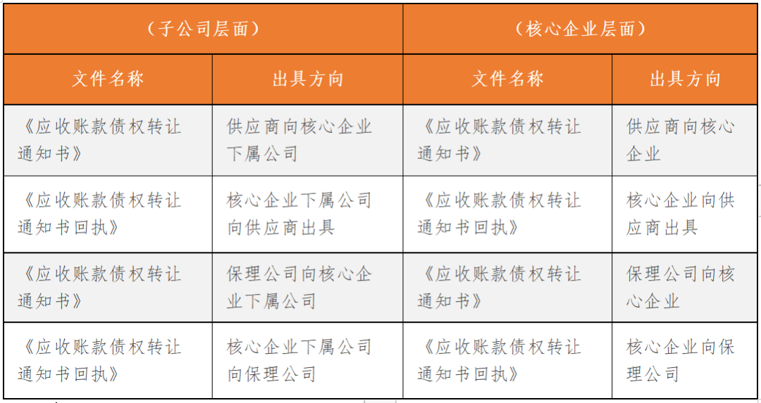 12)債權(quán)人、保理公司已將該筆應(yīng)收賬款債權(quán)轉(zhuǎn)讓予保理公司并最終將由保理公司信托予本信托的事宜向核心企業(yè)及其子公司發(fā)出書面通知并已取得核心企業(yè)及其子公司出具的書面回執(zhí);