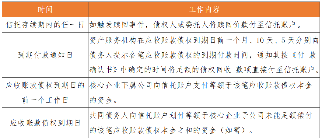 以“19攀鋼惠信ABN001”為例,基礎(chǔ)資產(chǎn)回收資金并不直接從債務(wù)人賬戶劃付至信托賬戶,而是將基礎(chǔ)資產(chǎn)回收資金從債務(wù)人的供應(yīng)鏈金融平臺(tái)業(yè)務(wù)賬戶逐級(jí)清分劃付至受托人的供應(yīng)鏈金融平臺(tái)業(yè)務(wù)賬戶。為此,項(xiàng)目設(shè)計(jì)如下風(fēng)險(xiǎn)緩釋:根據(jù)核心企業(yè)出具的《付款確認(rèn)書》中的約定,如信托賬戶在應(yīng)收賬款債權(quán)到期日次日未收到應(yīng)付款項(xiàng)的,核心企業(yè)將于應(yīng)收賬款債權(quán)到期日后第二日將到期未付的應(yīng)償金額支付至信托賬戶。