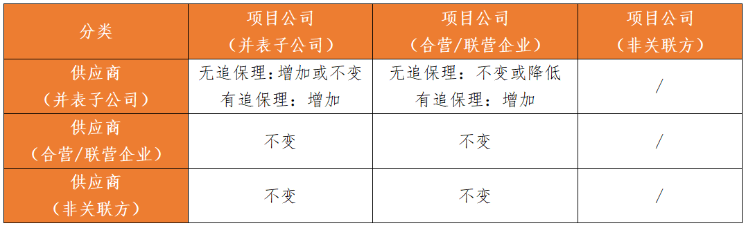 需要說明的是,一般項(xiàng)目公司的信用水平遠(yuǎn)低于核心企業(yè),風(fēng)險(xiǎn)敞口較大,項(xiàng)目公司是核心企業(yè)的合營(yíng)/聯(lián)營(yíng)企業(yè)的情況下,核心企業(yè)通過債務(wù)加入、差額補(bǔ)足的方式對(duì)項(xiàng)目公司進(jìn)行增信,對(duì)核心企業(yè)信用水平可能產(chǎn)生一定的負(fù)面影響。