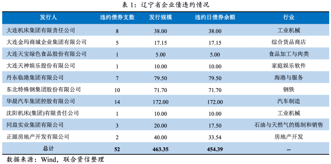根據Wind數據顯示,截至2021年11月末,遼寧省內企業債券違約主體10家,涉及債券52支,債券違約余額454.39億元,余額違約率為17.42%。除此之外,沈陽機床股份有限公司發行的中期票據通過現金、留債、股票等方式進行了債券清償;沈陽盛京能源發展集團有限公司發行的定向融資工具已由第三方代償,并未計入上述統計。從違約主體行業分布情況來看,遼寧省違約企業涉及汽車、石油化工、工業機械、海港、鋼鐵、房地產開發等領域,企業性質涉及地方國有企業及民營企業。