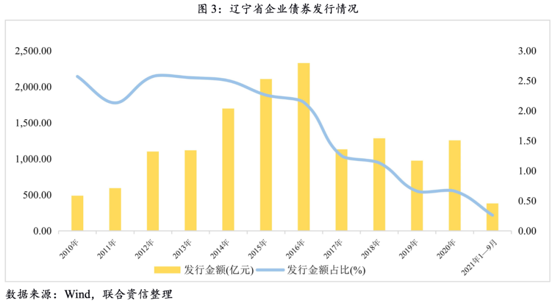 2016年3月,地方國有企業東北特殊鋼集團股份有限公司發行的“15東特鋼CP001”觸發實質性違約,截至2021年11月末,合計違約債券余額71.70億元;2020年10月,華晨汽車集團控股有限公司觸發實質性違約,截至2021年11月末,違約債券余額172.00億元。近年來,持續發生的公開市場違約以及部分地方國有企業打破剛兌都給遼寧省信用聲譽造成不利影響,資本市場債券發行規模明顯下降。從圖3中看出,2016年以后,遼寧省整體債券發行規模及占當年全國債券發行規模的比重都呈明顯下降態勢。