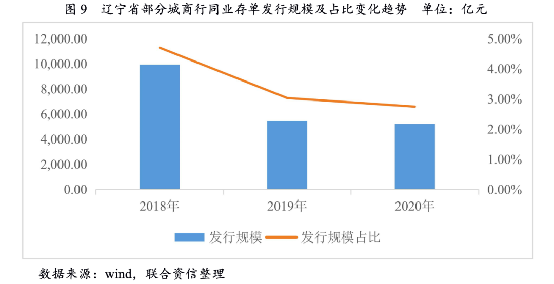 作為最早一批改革的城商行,遼寧省城商行業務種類較為豐富,同業負債來源廣泛。近年來,資本市場對于遼寧省內信用環境持審慎態度,對遼寧省整體城商行流動性產生一定影響。從遼寧省城商行同業存單發行規模來看,2018—2020年,遼寧省城商行同業存單發行規模持續下降,且占市場同業存單發行總量的比重持續下滑。從同業存單發行利率來看,樣本選取遼寧省城商行一年期同業存單發行利率,與一年期中債國債到期收益率進行比較,2020年遼寧省城商行同業存單發行規模下降的同時,利差明顯擴大。2019年,遼寧省城商行同業存單平均發行利差為0.88個百分點,2020年平均發行利差擴大至2個百分點。如前文所述,在存款業務拓展壓力加大的同時,遼寧省城商行同業融入規模有所收縮,且融資成本上升,同業負債業務難度有所上升。