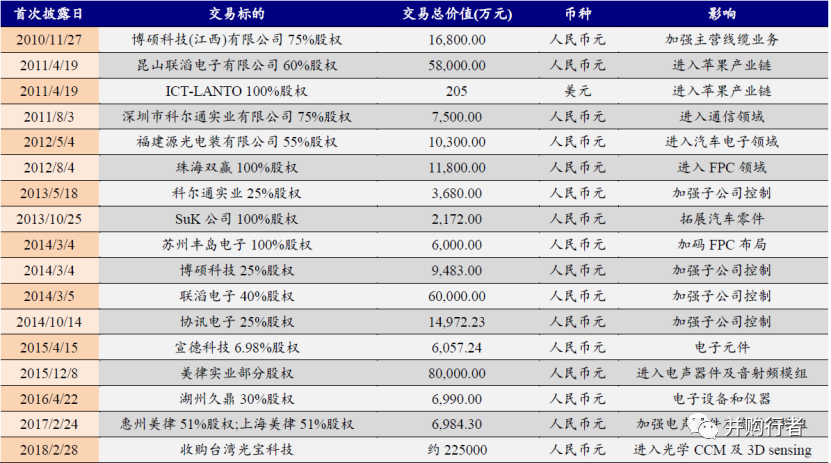 2016年、2017年為了切入聲學領域及蘋果聲學供應鏈,控股蘇州美特、上海及惠州美律;2018年為切入光學領域,收購光寶攝像頭事業部;