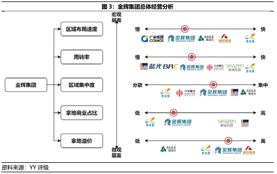 金輝集團的經營指標包括周轉率/區域集中度/綜合拿地占比表現均較為中庸(如圖3),但高價/溢價拿地情形較為普遍,疊加不具備投資性物業運營優勢,短期或面臨利潤遭壓縮的壓力,中長期亦面臨成本端上升造成的利潤擠壓。