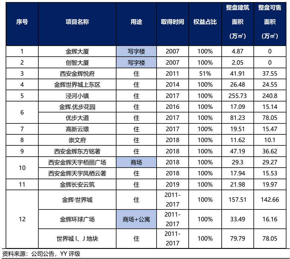 除了西安市場于17年之前存在價格洼地外,金輝集團之所以大規模布局于西安,或基于金輝嘗試利用獲取綜合用地降低土地成本,而于西安大規模布局。目前,金輝集團位于西安的12個存量項目存在較大體量的綜合商業自持,除了涇河小鎮或面臨去化壓力外,其余項目的區位較為核心。