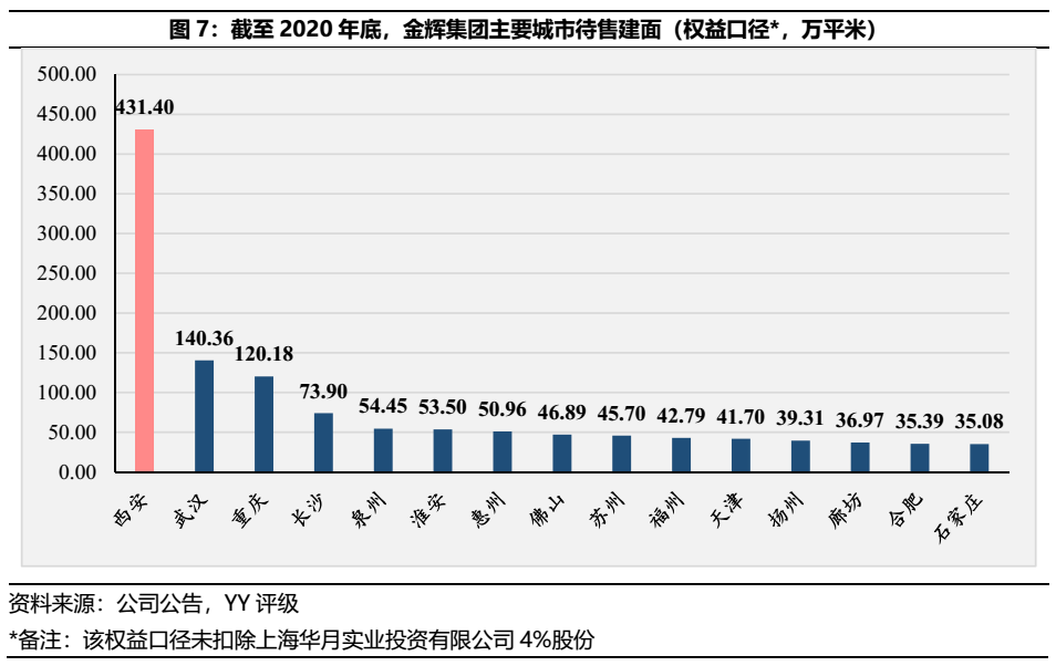 自各城市待售建面(權益口徑)統計可見,除了西安區域待售建面遠超于各城市,其余城市的待售建面較為平均。金輝集團的重倉西安策略或與集團為了解決土地成本問題有關,除了一般的住宅和公寓產品外,金輝集團的西安區域業態亦存在較多的持有型物業,致使截至20年末待銷售建面達431.40萬平米,約等于20多個中型樓盤。