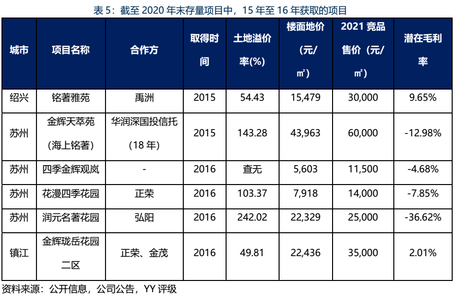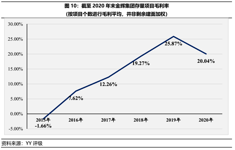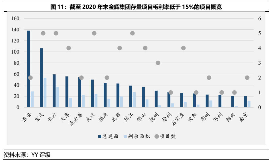 根據圖9對金輝集團截至20年末存量項目進行毛利率測算,并依照拿地時間進行排序,可發現自15至17年間存量項目毛利率僅為-1.66%、7.62%和12.26%,屬于第一波利潤壓縮期間,該問題始于金輝集團自身高溢價拿地造成。而20年新獲取的項目則為20.04%,將面臨第二波利潤壓縮。