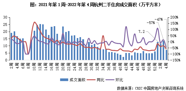 2022年第4周,杭州二手住房環比跌47%至7.2萬平方米,同比跌幅擴大至57%。2021年下半年以來杭州二手房市場持續下行后保持低位震蕩,前三周市場顯著放量回升但本周高位顯著回落,預計大幅震蕩后規?;蚱蠓€。