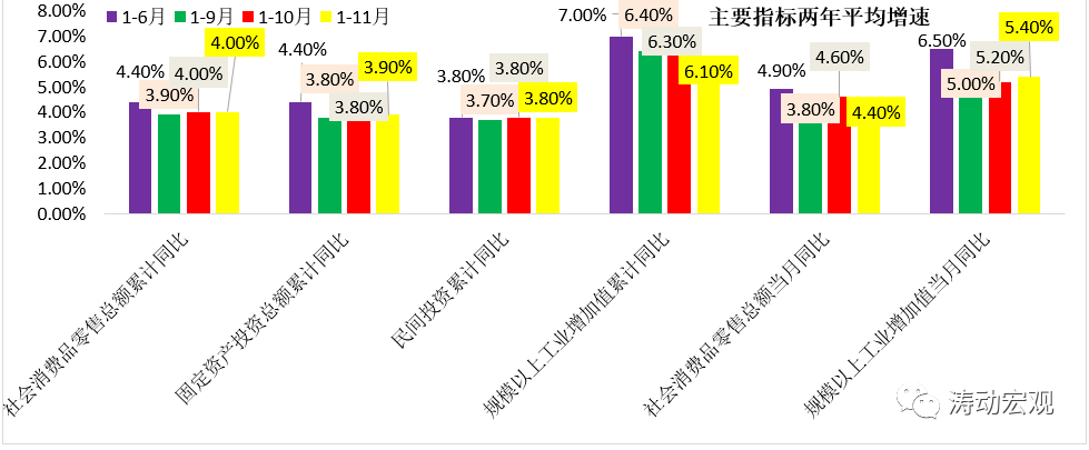 具體看,今年6-10月,房地產開發投資累計同比增速的兩年平均值分別為8.20%、8%、7.7%、7.2%和6.8%。今年6-11月,全國商品房銷售面積累計同比增速的兩年平均值分別為8.1%、10.25%、7.68%、4.60%、3.60%和3.10%,全國商品房銷售額同比增速的兩年平均值分別為14.70%、14.33%、10.82%、10%、8.8%和7.80%,顯然無論是地產開發投資,還是商品房銷售,均呈現出明顯下行態勢。