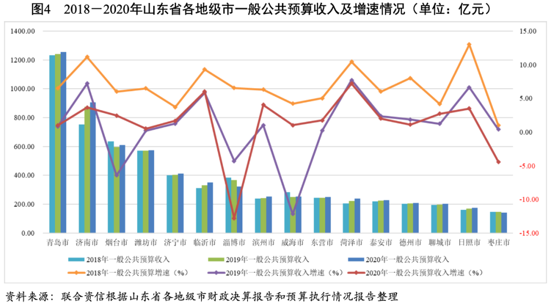 從一般公共預算收入來看,2018-2020年山東省大部分地級市的一般公共預算收入呈增長趨勢。2020年,青島市一般預算收入在山東省內遙遙領先,為1253.85億元;同期,濟南市、煙臺市和濰坊市一般公共預算收入均超過了500億元,分別為906.08億元、610.07億元和573.90億元。除日照市和棗莊市外,其余地級市一般公共預算收入均超過了200億元。一般公共預算收入增速方面,2018-2020年,受經濟增速放緩、減稅降費政策及新冠肺炎疫情等因素綜合影響,山東省各地級市一般公共預算收入增速均有不同程度下滑;2019年,威海市、淄博市和煙臺市為負增長,主要系減稅降費導致的稅收收入下降所致;2020年,威海市和煙臺市一般公共預算收入增速由負轉正,淄博市和棗莊市一般公共預算收入增速為負,其中淄博市一般公共預算收入下降幅度較2019年進一步擴大。