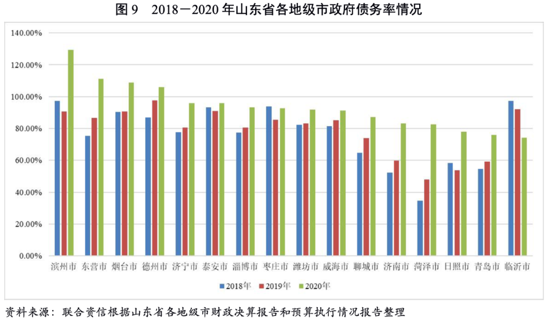 2018-2020年,除臨沂市和棗莊市外,山東省其他地級市政府債務率均呈增長態(tài)勢,菏澤市、東營市、濱州市和濟南市增速較快。2020年,濱州市政府債務率超過125%,東營市、煙臺市和德州市政府債務率均超過100%,濟寧市、泰安市、淄博市、棗莊市、濰坊市、威海市和聊城市政府債務位于85%~100%之間,其余地級市的政府債務率位于85%以下。整體看,山東省地級市政府債務償還壓力分化較為明顯,財政實力強的濟南市和青島市的政府債務償還能力強于其他地級市,相比之下,濱州市、東營市、煙臺市和德州市的政府債務償還壓力相對較大。
