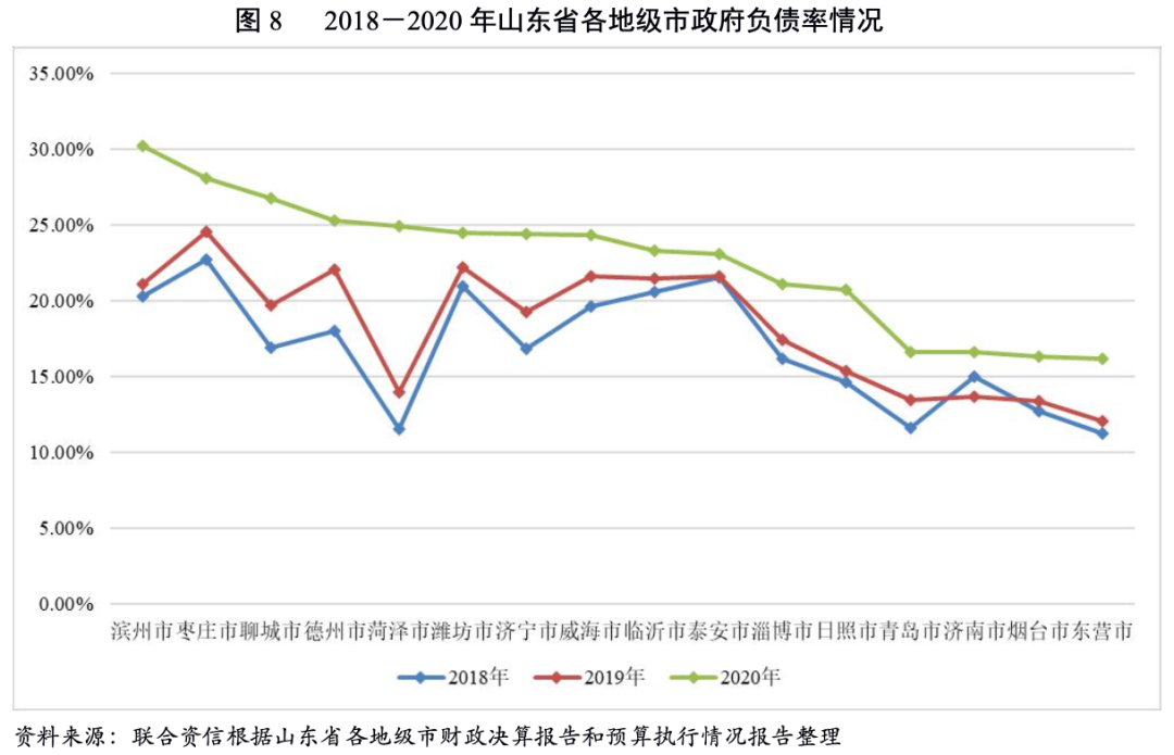 債務負擔方面,2018-2020年,山東省各地級市政府負債率均呈增長態(tài)勢。2020年,濱州市政府負債率為省內各地級市中最高(30.21%),較上年末增長9.15個百分點,菏澤市政府負債率增幅最大,為11.01個百分點。2020年,青島市、濟南市、煙臺市和東營市政府負債率低于20%。