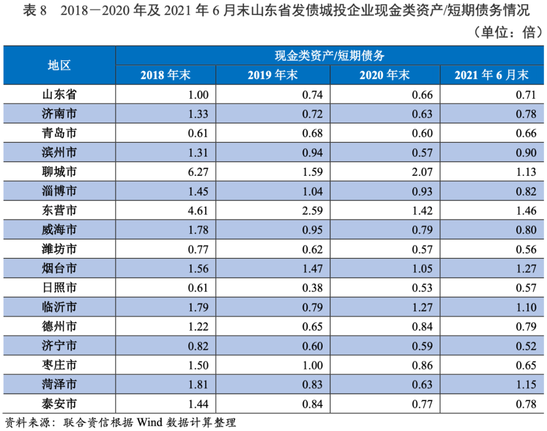 從發(fā)債城投企業(yè)債務負擔看,2018-2020年末,山東省發(fā)債城投企業(yè)整體資產負債率和全部債務資本化比率呈上升趨勢,山東省發(fā)債城投企業(yè)的債務負擔有所加重。從山東省各地級市城投企業(yè)債務指標看,截至2021年6月末,濟南市、青島市、濟寧市和泰安市的城投企業(yè)資產負債率均超過60%、全部債務資本化比率均超過50%,上述地級市的城投企業(yè)債務負擔較重。