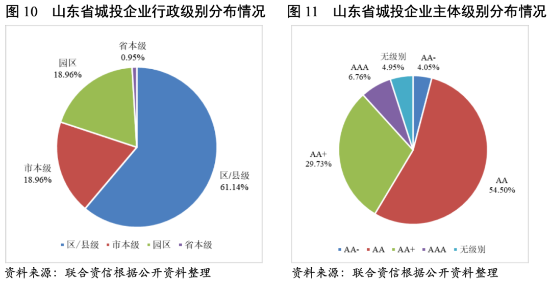 截至2021年10月28日,山東省有存續(xù)主體級別的城投企業(yè)共211家。其中,省本級城投企業(yè)2家,地級市本級城投企業(yè)40家,地級市下轄區(qū)級及縣級(含縣級市)城投企業(yè)129家,園區(qū)城投企業(yè)40家;主體級別為AAA的城投企業(yè)15家,主體級別為AA+的城投企業(yè)66家,主體級別為AA的城投企業(yè)121家,主體級別為AA-的城投企業(yè)9家。分地級市來看,濰坊市的城投企業(yè)數量最多,為42家,其次為青島市(41家)、威海市(16家)、臨沂市(15家)、濟南市(15家)、濟寧市(15家)和淄博市(11家),其余地級市城投企業(yè)數量相對較少。從級別分布看,AAA城投企業(yè)主要集中于省本級及經濟財政實力強的青島市和濟南市,其余地級市中只有煙臺市、臨沂市和濰坊市各有1家AAA城投企業(yè),但上述地級市與青島市和濟南市的經濟和財政實力存在一定的差距。除聊城市和日照市以外,其余地級市均有AA+級別城投企業(yè),聊城市和日照市城投企業(yè)最高級別為AA,級別為AA-的城投企業(yè)全部位于區(qū)縣和園區(qū)。