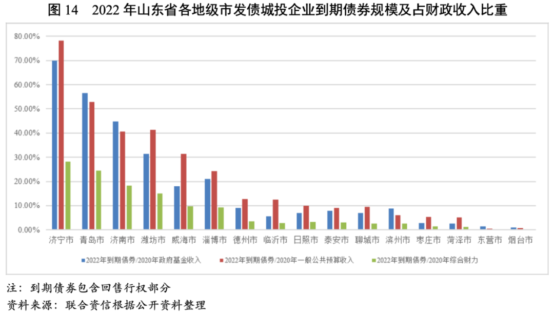 從城投企業(yè)2022年到期債券規(guī)模占2020年一般公共預算收入或政府性基金收入的比重來衡量一般公共預算收入或政府性基金收入對到期債券的覆蓋情況,償債壓力較大的城市為濟寧市、青島市、濟南市和濰坊市;以2020年綜合財力對城投企業(yè)2022年到期債券覆蓋程度來衡量2022年城投債券的到期償還壓力,2022年到期債券占2020年綜合財力比重較高的城市仍然為濟寧市、青島市、濟南市和濰坊市,占比分別為28.22%、24.18%、18.18%和16.72%。總體看,濟寧市、青島市、濟南市、濰坊市和威海市城投企業(yè)到期債券的集中償付壓力較大。