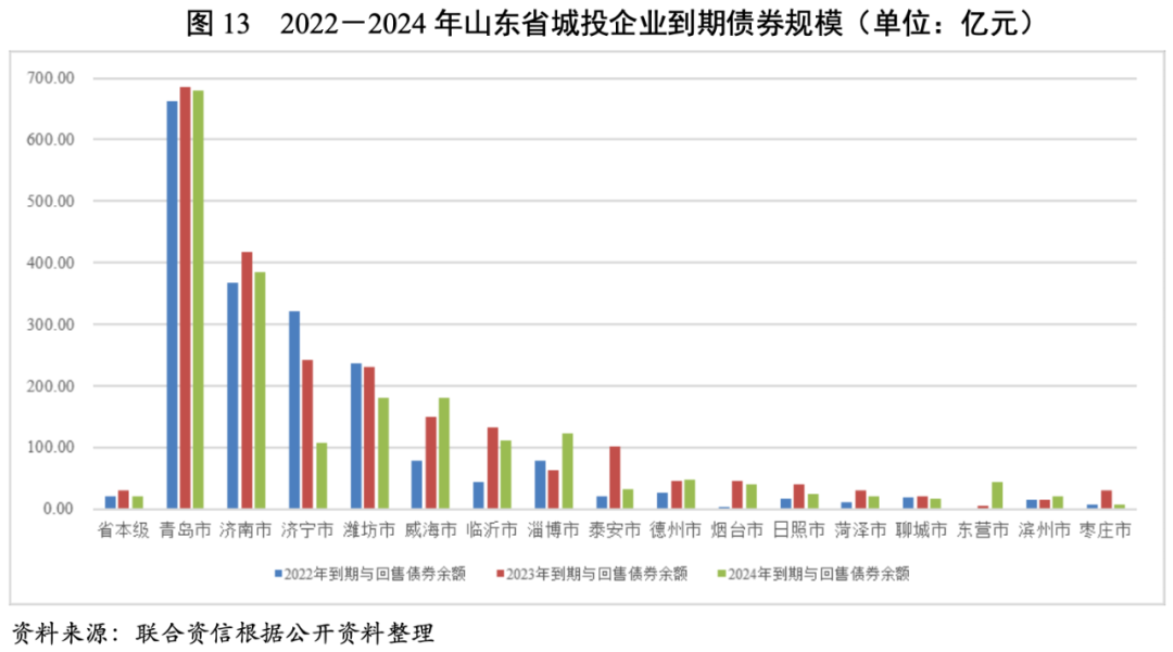 2020年以來,山東省大部分地級市發(fā)債城投企業(yè)債務負擔加重,整體流動性趨緊,償債壓力加大。各地級市發(fā)債城投企業(yè)債務償還仍主要依賴于外部籌資,各地級市融資狀況有一定差異。青島市和濟南市的城投企業(yè)未來三年到期債券規(guī)模大,其中濟寧市、青島市、濟南市和濰坊市的城投企業(yè)2022年到期債券集中償付壓力較大。