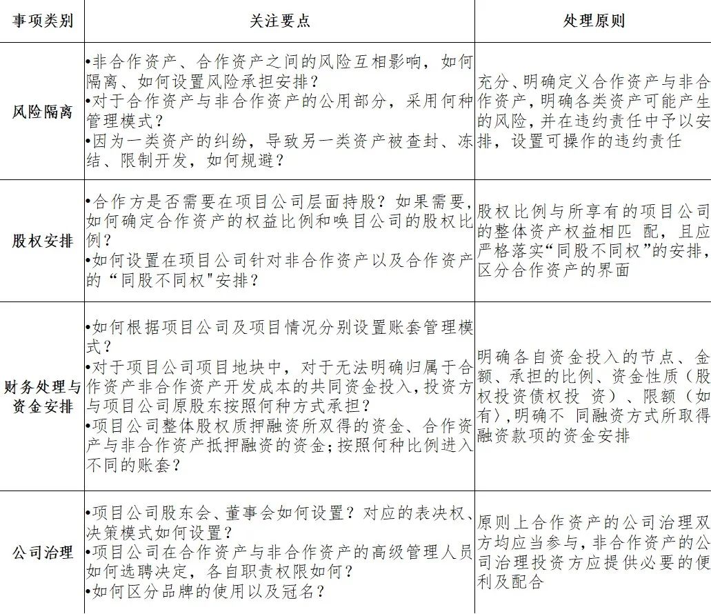 分賬套合作開發(fā)項(xiàng)目的核心風(fēng)險(xiǎn)則主要在于:項(xiàng)目公司內(nèi)部的切割可能會(huì)因?yàn)槲谋炯s定模糊、各地實(shí)踐落地不同等而出現(xiàn)糾紛;以及項(xiàng)目公司內(nèi)部的界面劃分僅對(duì)內(nèi)有約束力,而無法對(duì)外部第三方產(chǎn)生效力導(dǎo)致協(xié)議履行中發(fā)生糾紛。