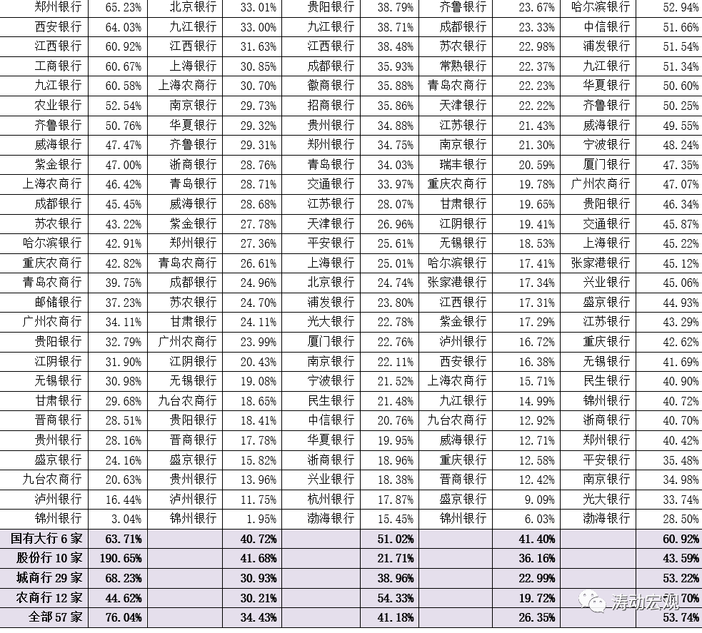 3、上市銀行的存款占其總資產(chǎn)的比例平均為64.80%,和2020年底的64.57%基本持平。其中,國有大行與農(nóng)商行最高(分別達(dá)到74.89%和74.83%),股份行最低(僅為57.70%)。這意味著股份行對同業(yè)融資的依賴性較高。