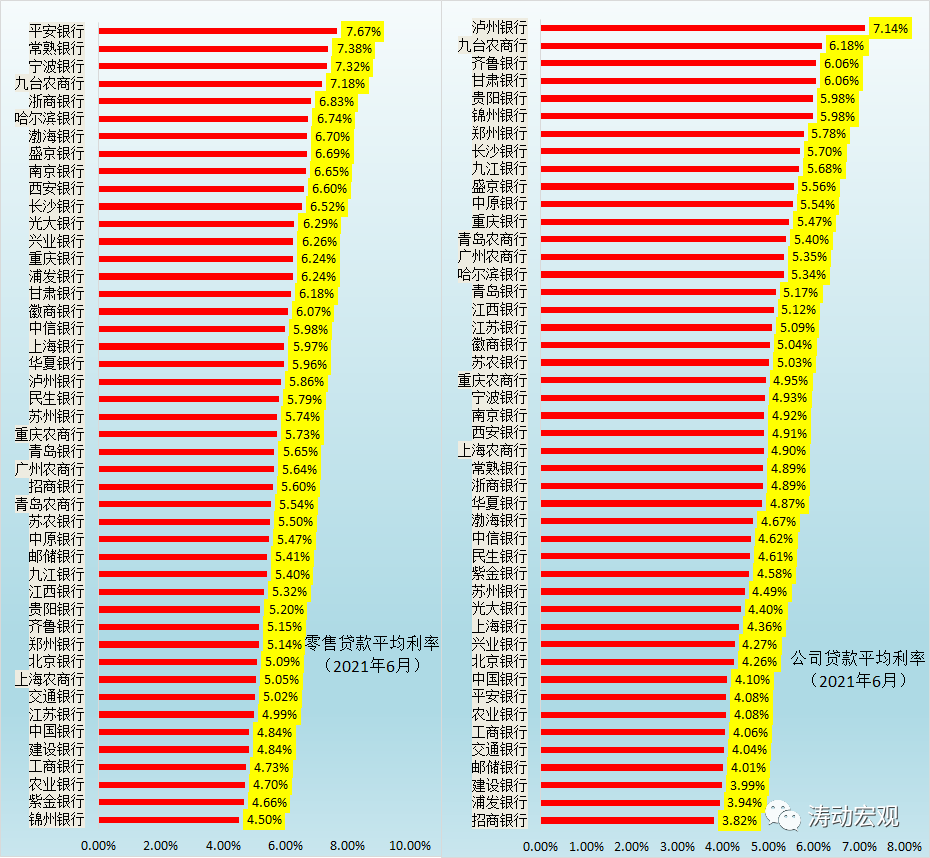 1、46家銀行的零售貸款利率平均為5.83%,其中有7家銀行低于5%、4家銀行高于7%。零售貸款利率較高的銀行主要有平安銀行(7.67%)、常熟銀行(7.38%)、寧波銀行(7.32%)與九臺農(nóng)商行(7.18%)。