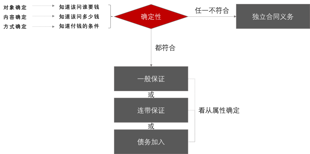 在上面我們學(xué)習(xí)了如何找主演,找到主演,那么就能排除獨(dú)立的合同義務(wù)——那么這個(gè)增信就只可能是一般保證、連帶保證5或者債務(wù)加入三種中的一種。