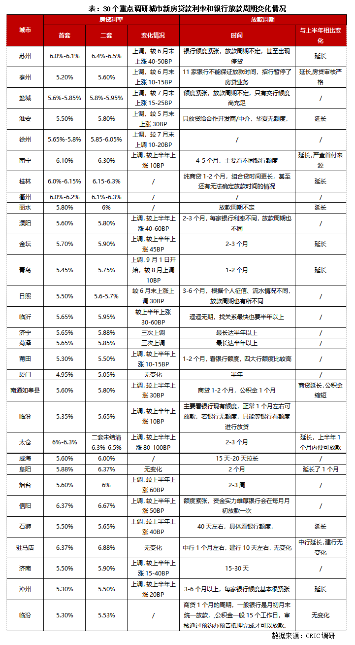 自年初央行推出房地產(chǎn)貸款集中度管理制度以來(lái),各地“上行下效”,捂緊錢(qián)袋子,也出現(xiàn)了房貸額度緊張、放款周期拉長(zhǎng)、貸款利率上調(diào)等現(xiàn)象。不過(guò)近期市場(chǎng)傳聞,下半年貨幣政策將向?qū)捫庞棉D(zhuǎn)向,推動(dòng)銀行加碼信貸投放,部分銀行已接到窗口指導(dǎo)加大8月末的信貸投放,如若傳聞屬實(shí),勢(shì)必會(huì)帶動(dòng)社會(huì)融資規(guī)模總量穩(wěn)步回升,對(duì)地產(chǎn)行業(yè)是否也存在一定的利好刺激?帶著這樣的疑問(wèn),我們于近期調(diào)研了30個(gè)重點(diǎn)城市的房貸利率和回款周期變動(dòng)情況。