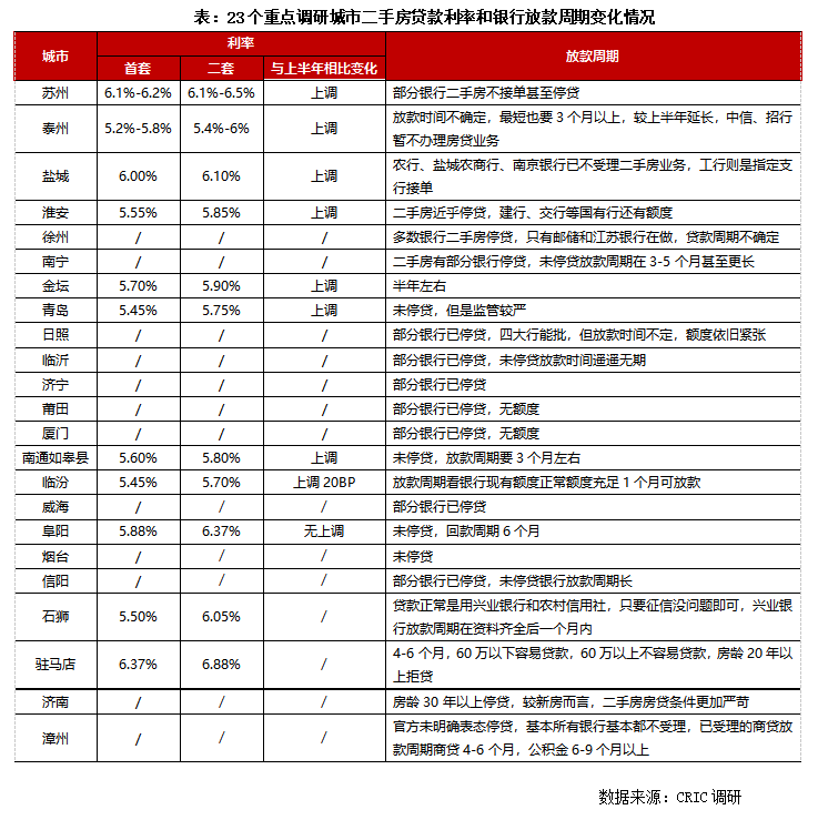 我們調(diào)研的23城中有6成以上銀行已經(jīng)出現(xiàn)了二手房停貸現(xiàn)象或是放款時(shí)間遙遙無(wú)期。即便是尚未停貸城市,多數(shù)放款周期也在3-6個(gè)月,較上半年有不同程度的延長(zhǎng),同時(shí)銀行方面也加強(qiáng)了貸款監(jiān)管,關(guān)于貸款額度,抵押房屋的房齡等都有明確要求,整體二手房的貸款難度還是要大于新房貸款的。