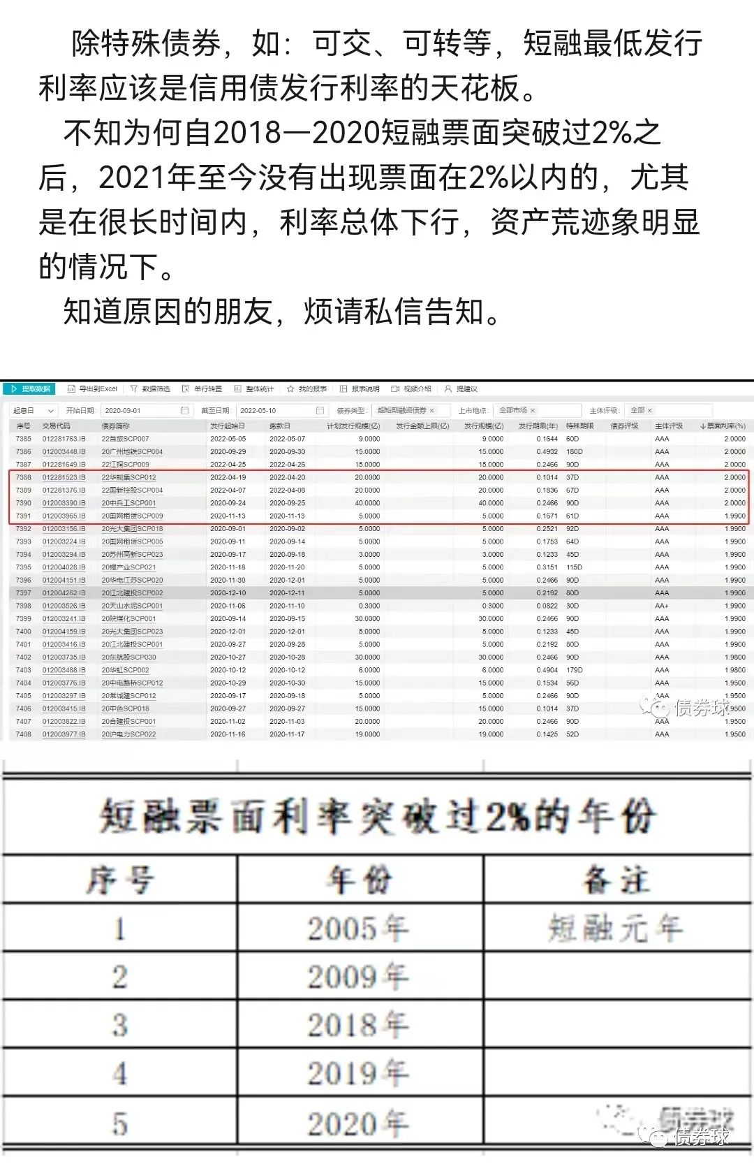 而在此之前,2018-2020連續(xù)3年出現(xiàn)突破2%的情況,其中2020年突破2%的案例特別多,就短融來(lái)說(shuō),突破2%的有1339只,最低的票面只有0.95%,20招商局SCP001。