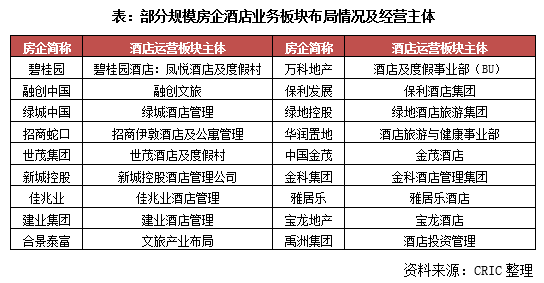 截至目前,在TOP50規模房企中有不少企業都已經成立了獨立的酒店業務板塊,如碧桂園酒店(鳳悅酒店及度假村)、萬科酒店及度假事業部(BU)、融創文旅、保利酒店集團、綠城酒店管理等。此外,綠地、招商、華潤、世茂、金茂、新城、金科、佳兆業、雅居樂等規模房企也都有相對成熟的酒店業務管理公司。