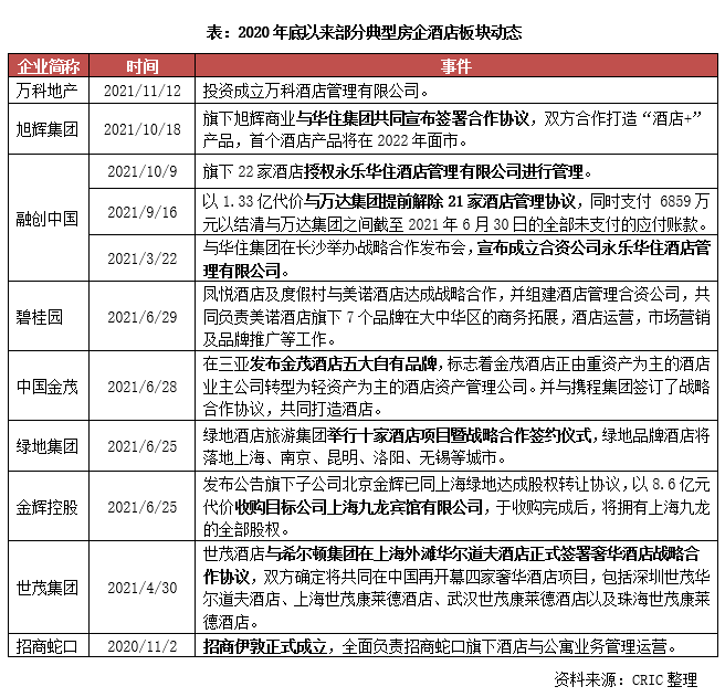 今年以來,碧桂園、萬科、融創、金茂、綠地、旭輝等多家規模房企在酒店板塊均有所動作,更多地加強了運營管理層面構建。以融創為例,2021年3月與華住集團宣布成立合資公司永樂華住酒店管理有限公司,持股50%,完成了自營平臺的搭建。9月即與萬達集團提前解除21家酒店管理協議,隨后將該21家酒店與哈爾濱融創萬達嘉華酒店均授權至永樂華住進行管理。從這一系列動作來看,融創在加速構建酒店板塊自營競爭力。另外,融創在2021 年中期業績會中也表示,“地產+”業務是未來三年重要發力,占比盡快超過集團10%??梢灶A計,酒店板塊作為“地產+”業務核心賽道之一,中長期將作為企業戰略重點推進。