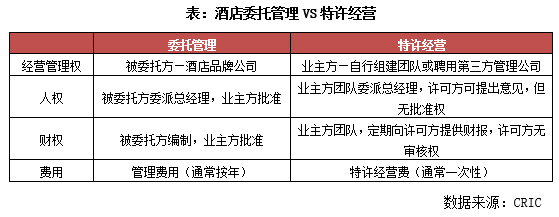 對于初涉酒店行業、缺乏相關經驗的房企而言,合作模式是較快的切入方式。在合作模式中,“委托管理”和“特許經營”是兩種最主要的模式。這兩種模式的共同點在于,房企均可通過合作,借助合作方酒店的品牌優勢快速打開市場,進入門檻較低。