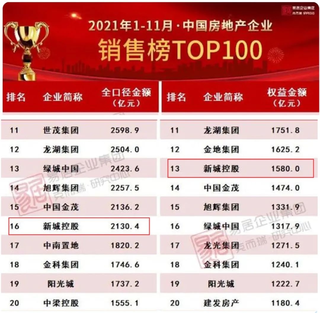 根據(jù)最新發(fā)布的克而瑞“2021年1-11月中國房地產(chǎn)企業(yè)銷售榜TOP100”名單,杠桿地產(chǎn)看到新城控股的全口徑銷售額排名16,權(quán)益銷售額以1580億元排名13。權(quán)益占比大概在74%。